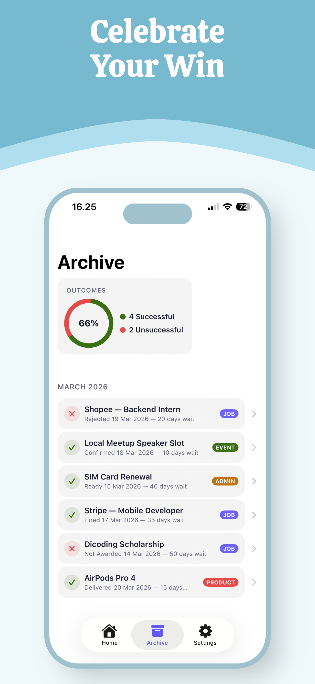 Archive tracks your outcomes. See your success rate with visual analytics.